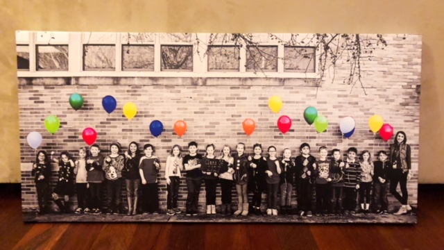 The students in Mrs. Daniels 3rd grade class joined together for a unique photo for their class auction project. While the children and background are black and white, the bright and vibrant balloons symbolize the colorful and energetic environment this class creates when together. The photo was printed on a heavy canvas and measures 42 X 20.
