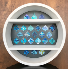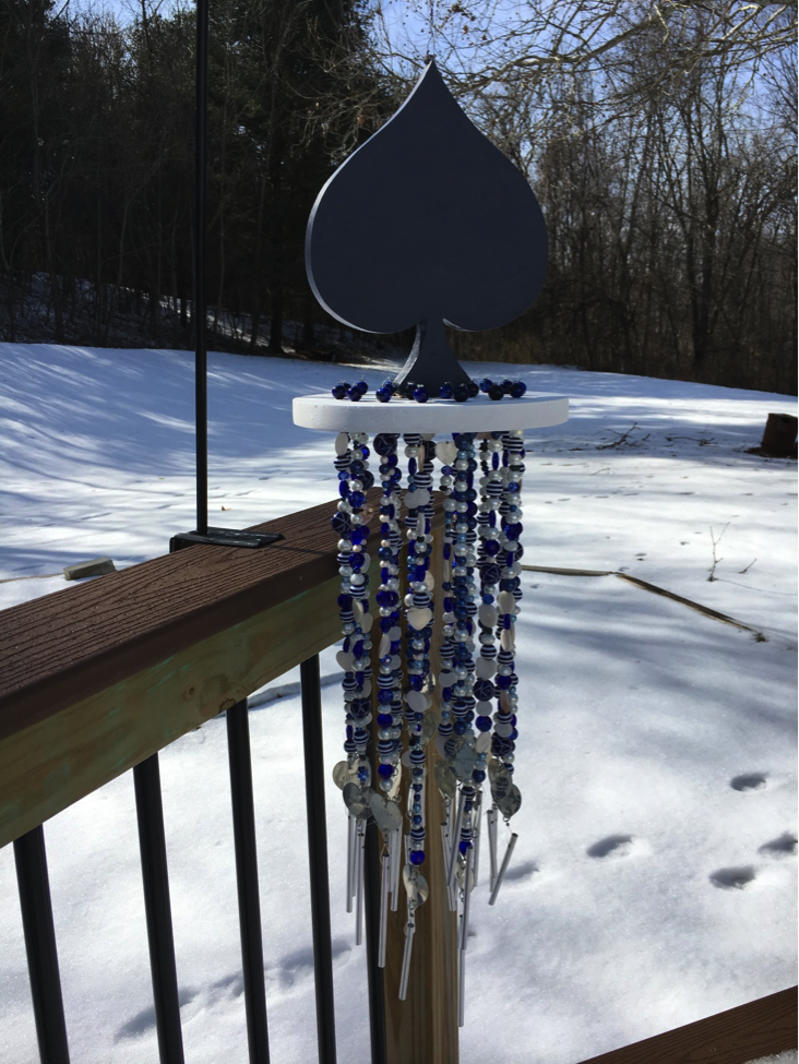 While this unique Blue Aces Wind Chime may not “Rock your socks off,” it’s sure to sweetly please your ears and eyes! Mrs. Ludwig’s third-grade students each enjoyed crafting a strand of blue and white colored beads with a personalized hand-stamped heart-shaped name tag. The sturdy base was exclusively designed and hand-crafted from wood and painted blue and white to go with the Aces theme.