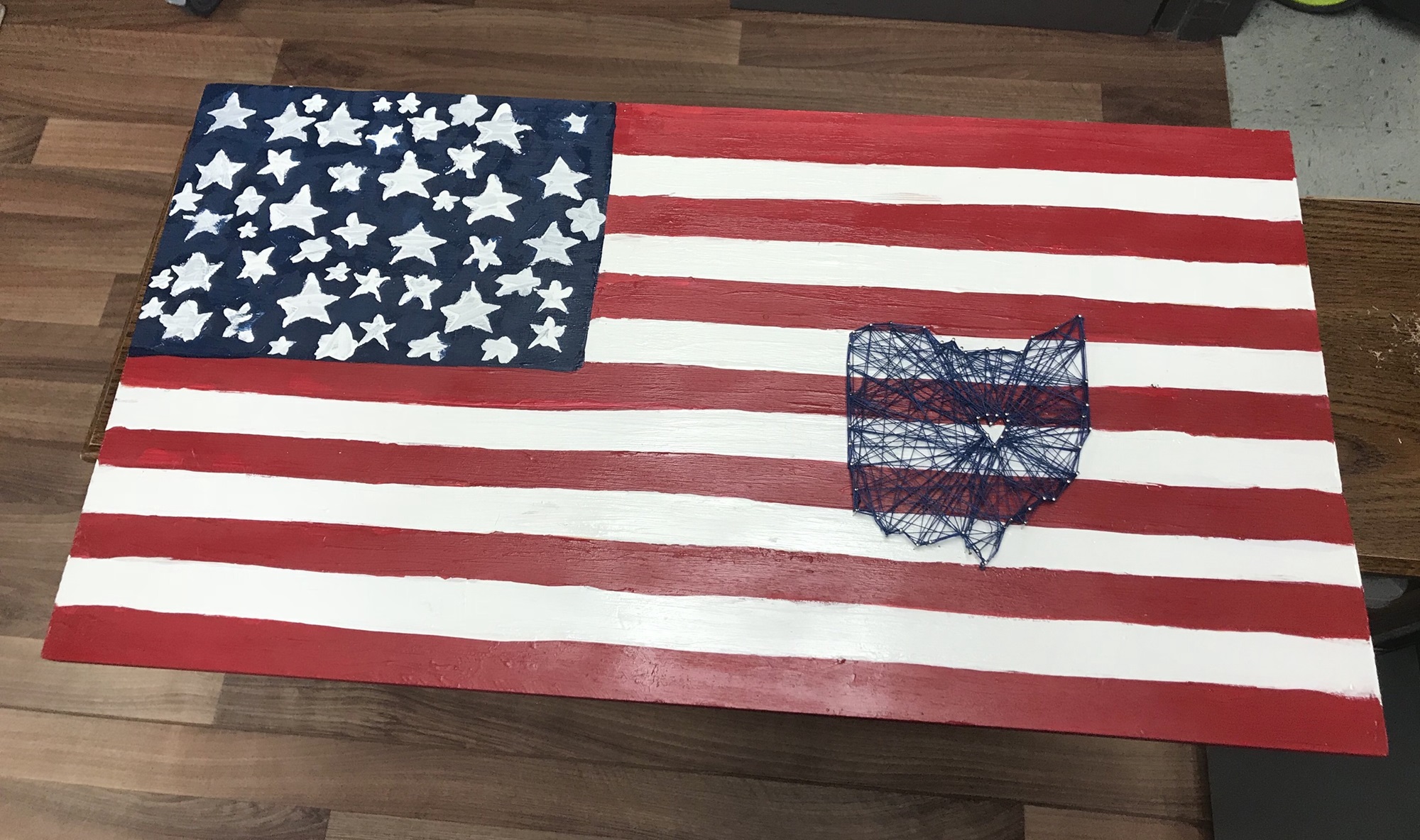 Mrs. Giannetto’s fifth grade class worked diligently to measure out, design, and paint our gorgeous American flag on a beautiful pine wood slab. The children then took a template of Ohio and created the shape of Ohio with a heart over Granville and completed a beautiful string art project right on the flag.