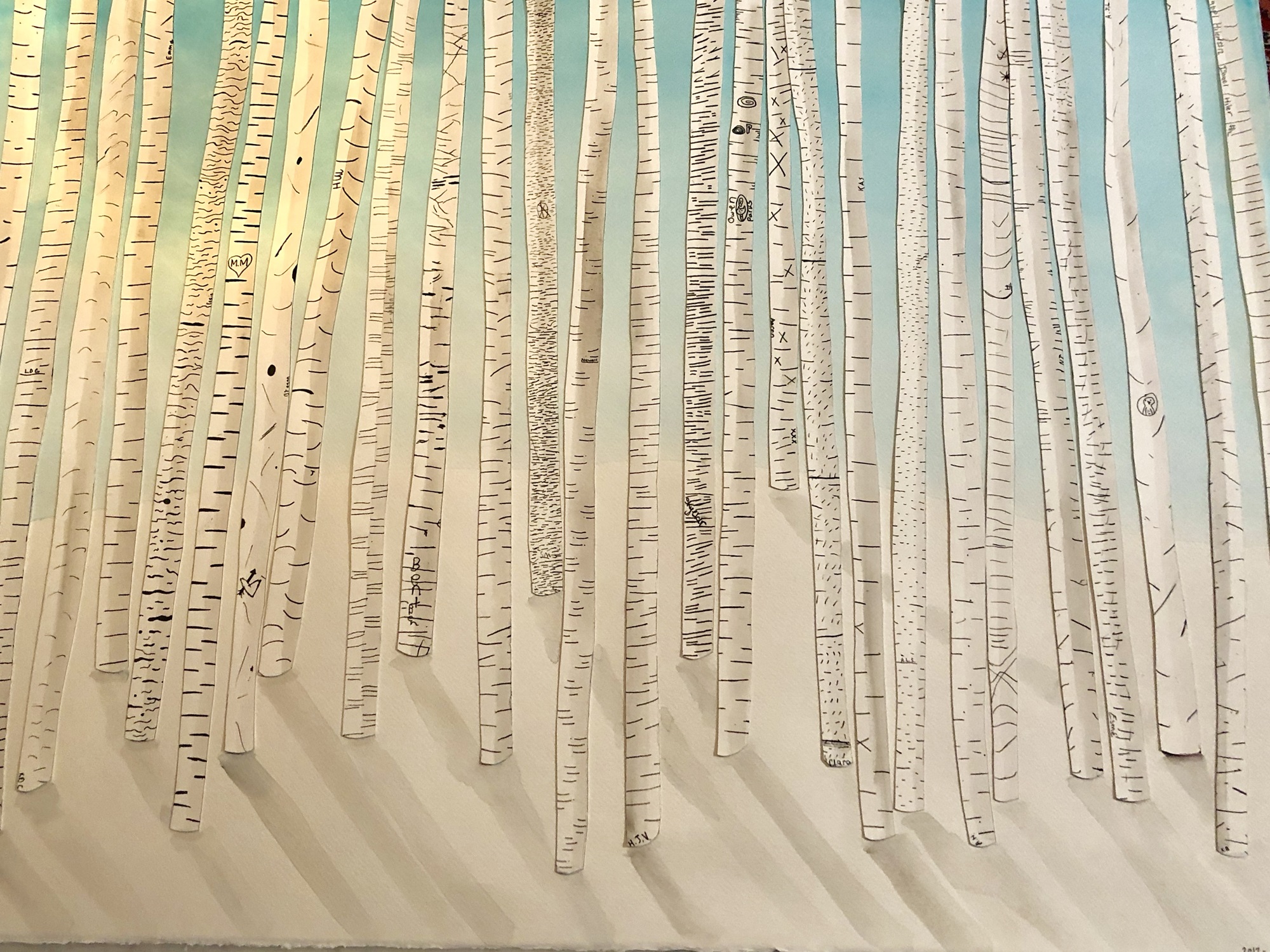 Mrs. Newell’s class created a lovely birch tree snowscape collage mounted on a 22” x 30” heavy watercolor paper canvas. Each student, along with Mrs. Newell, crafted his or her own birch tree on watercolor paper strips using fine-tipped black markers. Students personalized their trees with names, initials or symbols.